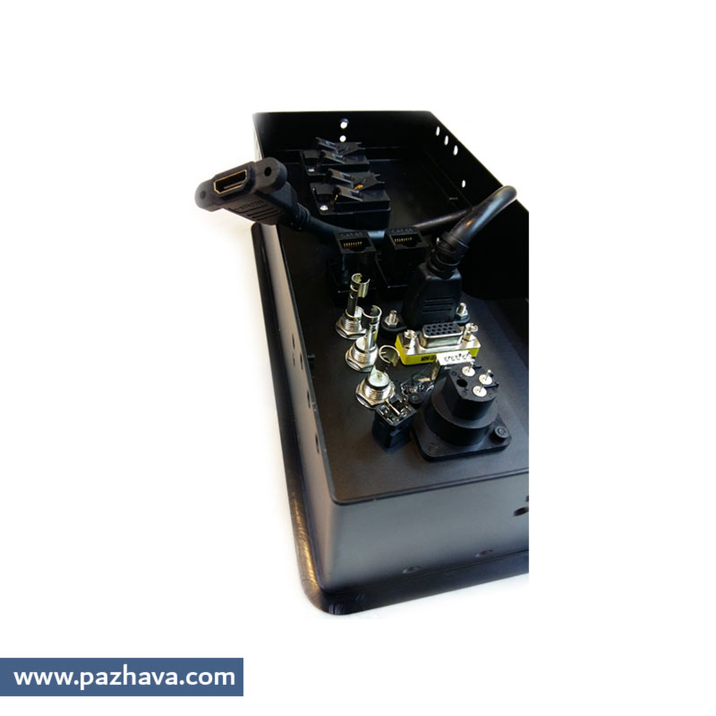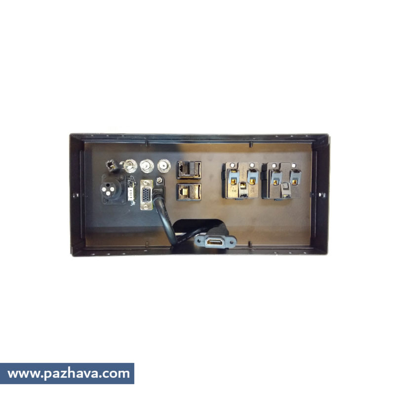باکس کف سن سالن همایش مدل ZB603 دارای 2 عدد خروجی برق با پورت یونیورسال.درگاه HDMI، درگاه VGA، سه پورت RCA, ورودی میکروفونXLR ,USB ,ورودی جک هدفونی صدا,2عدد پورت شبکه.
